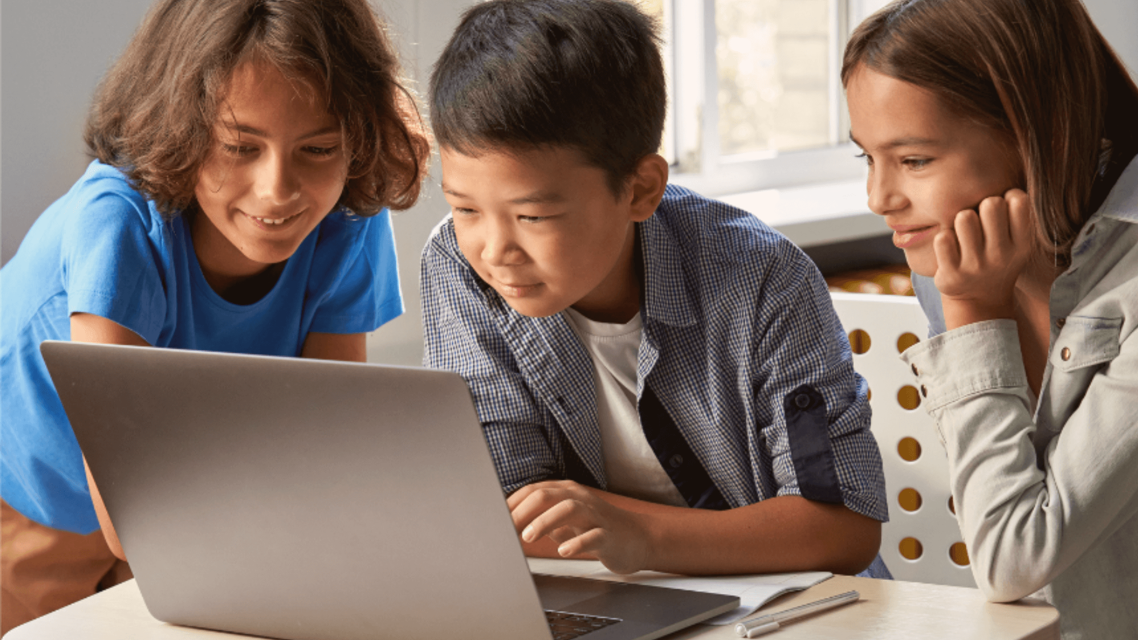 Three children sit together at a table, smiling and looking at a laptop screen. Sunlight comes through a window behind them, and a notebook with a pen lies on the table nearby.